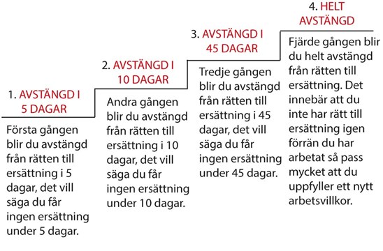 Efter varje gång du på något sätt förlänger din arbetslöshet trappas åtgärderna upp och du hamnar på olika steg på åtgärdstrappan.Du anses förlänga din tid i arbetslöshet om du: