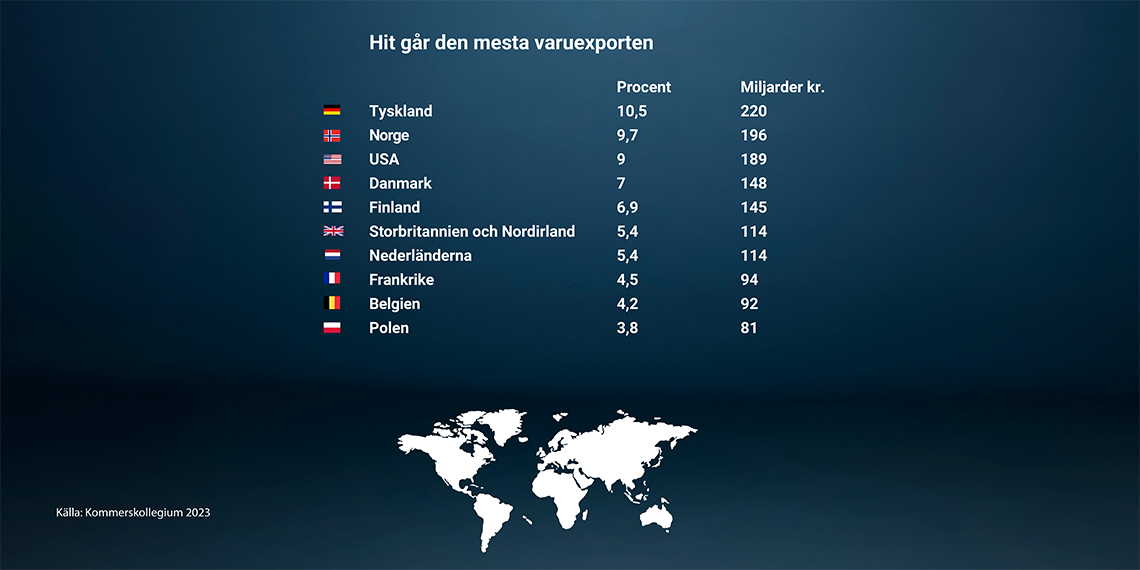 Omkring 80 procent av den svenska industriproduktionen exporteras alltså till andra länder. När man tittar på vilka länder Sverige exporterar mest till ser man att de flesta länder tillhör