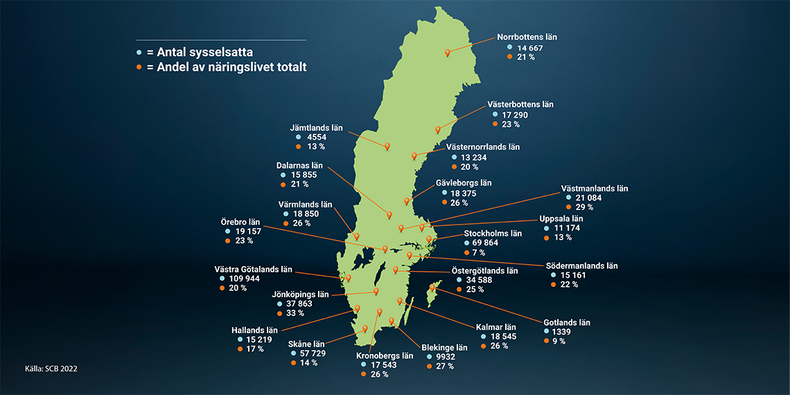 Exporten skapar jobb i hela landet. I såväl mindre bruksorter som på större industriområden i våra storstäder. I nordliga Norrbottens län står industrin för över en femtedel av arbetstillfällena inom näringslivet. I sydliga Jönköpings län är motsvarade andel så mycket som en tredjedel!