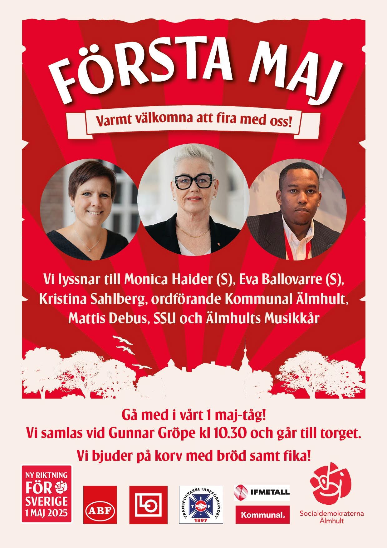 Första maj firandet i Älmhult första maj tåget avgår från Gunnar Hröpe klockan 10.30 och klockan 11.00 så börjar firandet på torget i Älmhult.