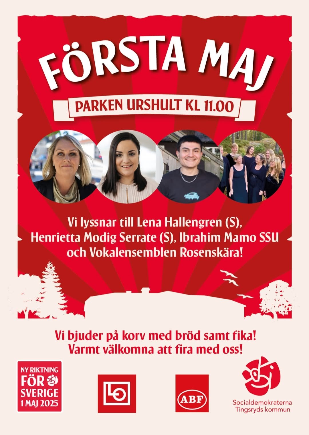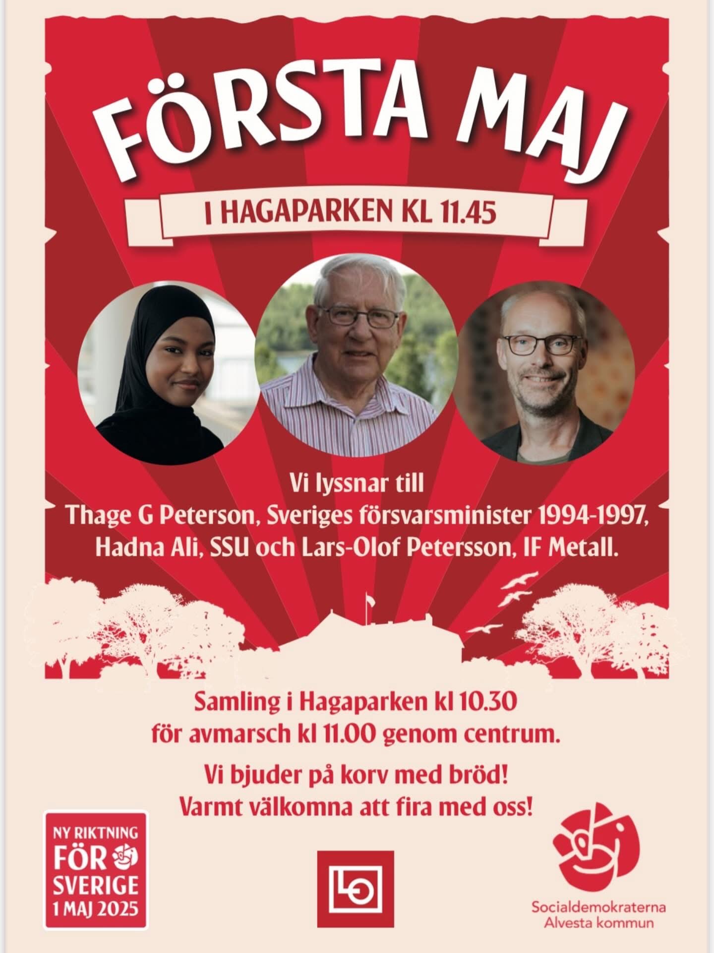 Klockan 11.45 så börjar första maj firandet i Hagaparken med medverkande talare Thage G Peterson, Hadna Ali och Lars-Olof Pettersson IF Metall.