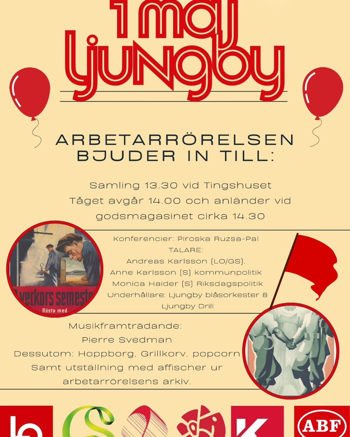 Första maj i Ljungby samling vid Tingshuset klockan 13.30 Tåget avgår klockan 14.00 och anländer vid godsmagasinet cirka klockan 14.30.