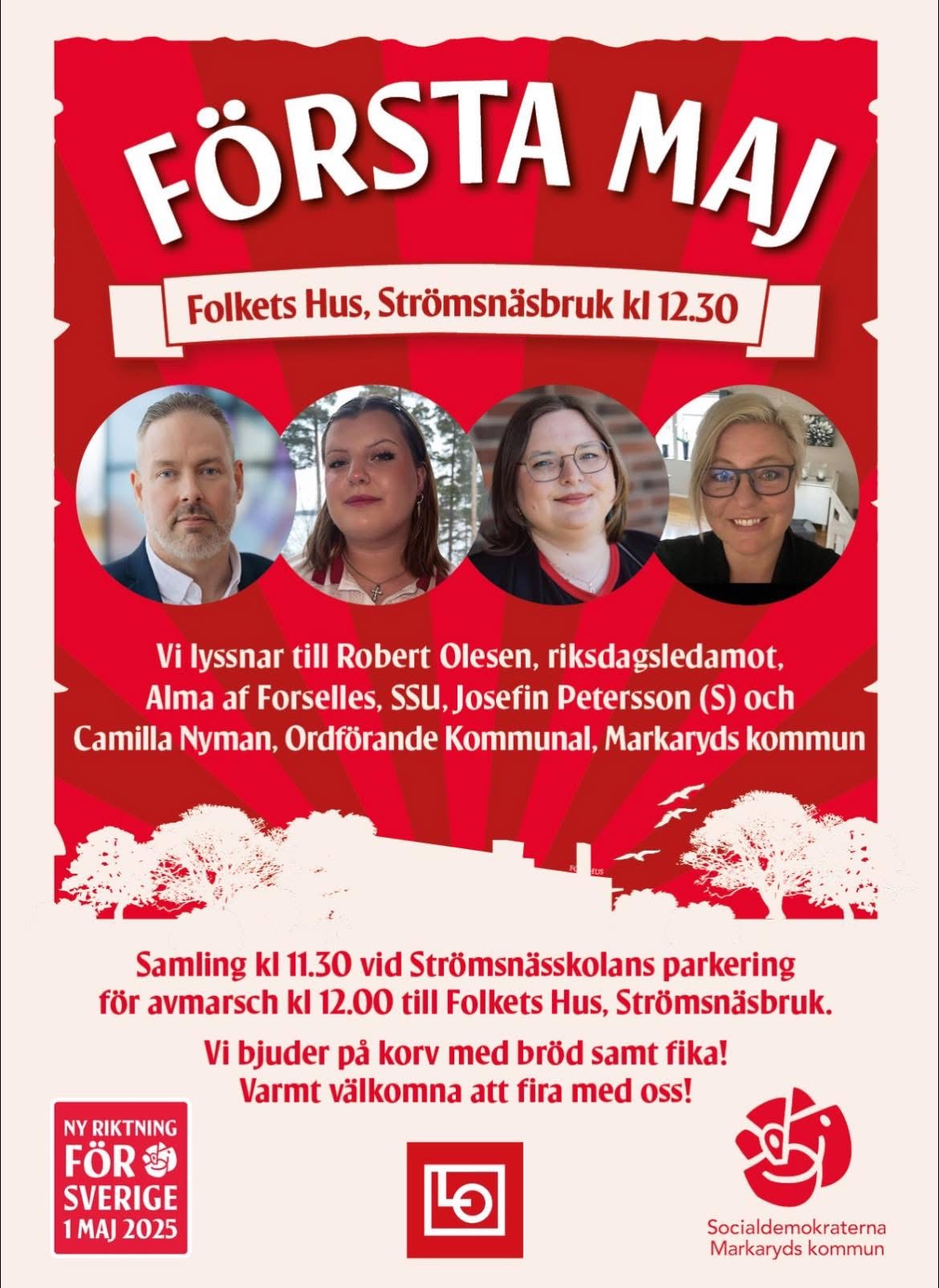 Första maj i Markaryd/Strömsnäsbruk samling klockan 11.30 vid Strömsnässkolans parkering för avmarsch klockan 12.00 till Folkets Hus i Strömsnäsbruk.