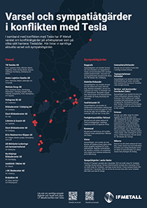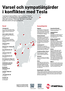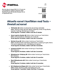 I den här utskrivbara pdf:en samlar vi samtliga sympatiåtgärder och varsel som lagts i IF Metalls konflikt med Tesla. Dokumentet byts ut så snart en ny sympatiåtgärd eller ett nytt varsel är lagt. Senast uppdaterat dokument 2025-06-02.
