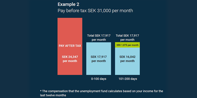 If you earn more than the unemployment fund ceiling, the income insurance will enable you to get up to 80 per cent of your qualifying income* between SEK 33,000 and 50,000 – from day 1 to day 100. If you earn less than the unemployment ceiling, you can get up to 80 per centof your qualifying income between SEK 27,500 and 33,000 kronor – from day 101 to day 200 (when the compensation from the unemployment fund is reduced). It is also possible to take supplementary insurance for a further 100 days’ compensation and income over SEK 50,000.