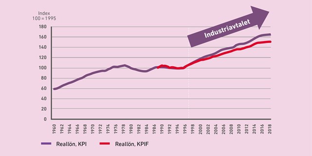 Löneökningar i förhållande till inflationsmåtten KPI och KPIF.